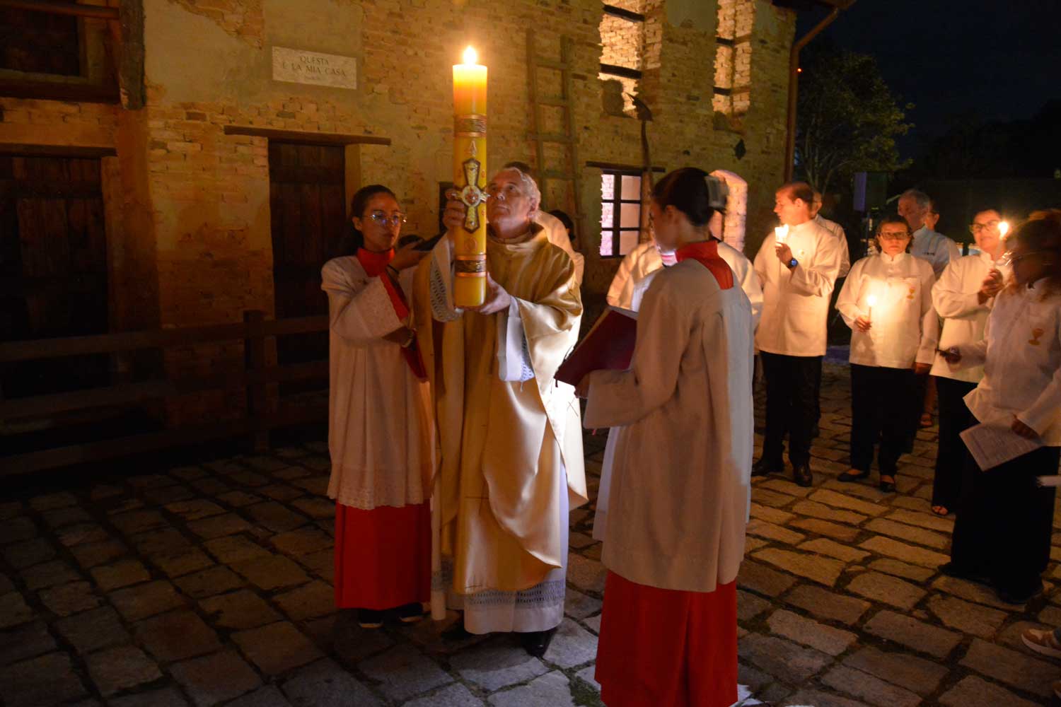 A Vigília Pascal reuniu cerca de 400 fiéis em uma celebração profundamente simbólica e emocionante. Diante da Réplica da Casa de Dom Bosco e na escuridão do ambiente, o Pe. Agnaldo realizou a bênção do fogo novo, acendeu o Círio Pascal e distribuiu a luz aos fiéis.
