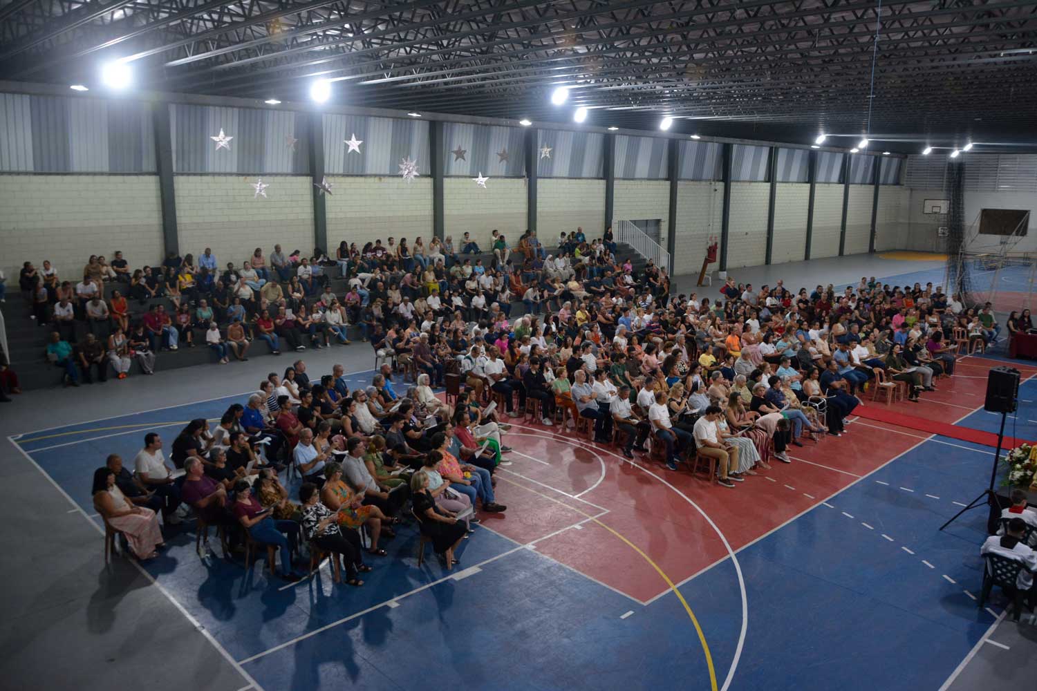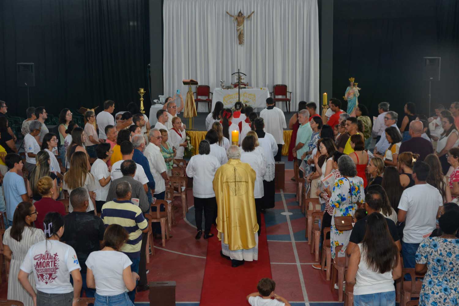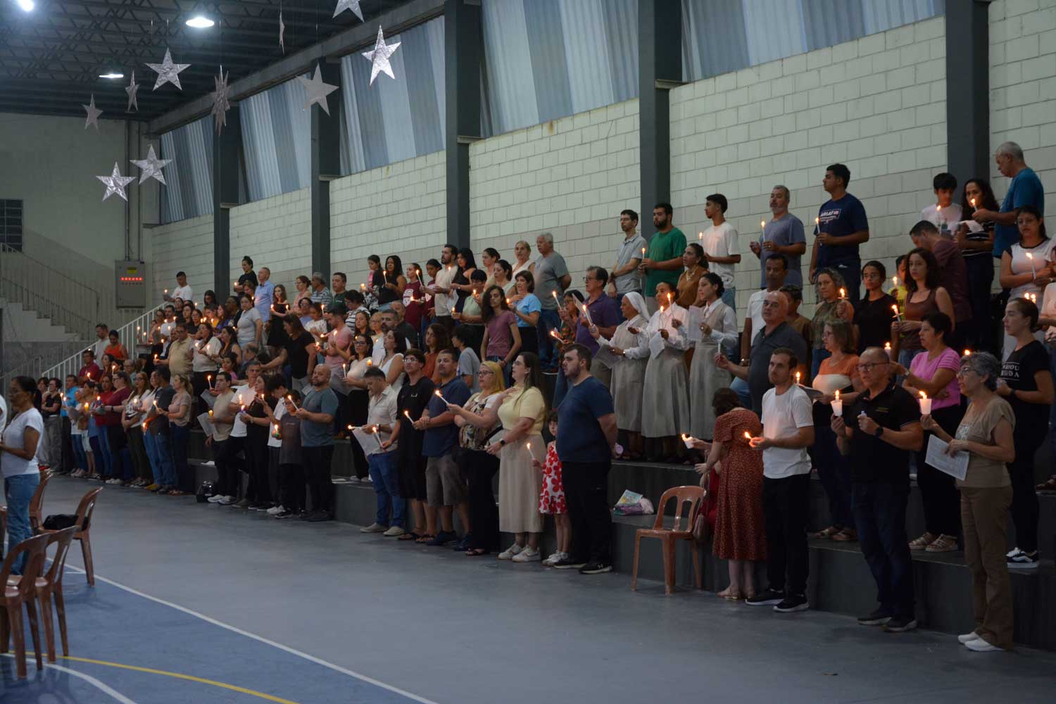 A procissão luminosa seguiu até a quadra coberta, onde aconteceram a Liturgia da Palavra, a renovação das promessas batismais e a celebração da Missa da Ressurreição do Senhor, culminando com grande fervor e alegria pascal.