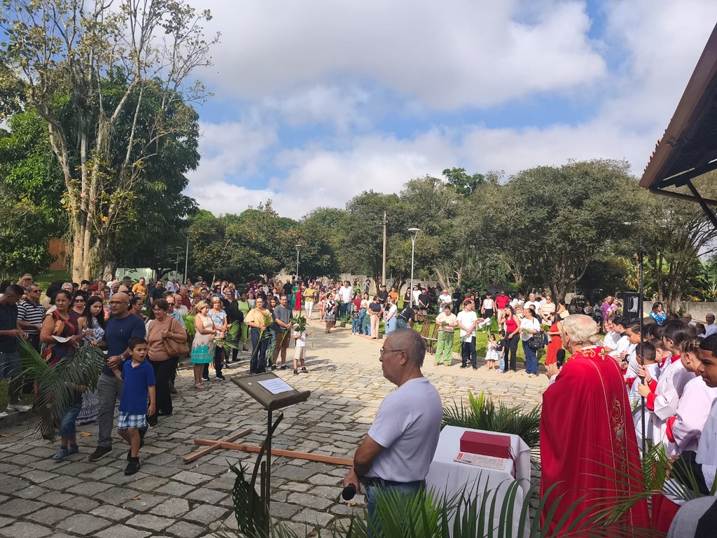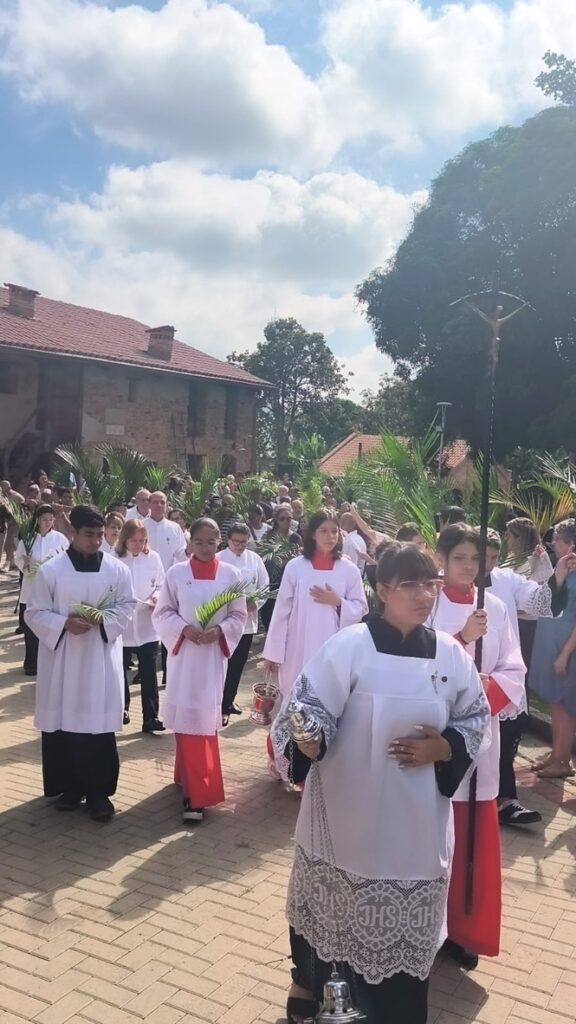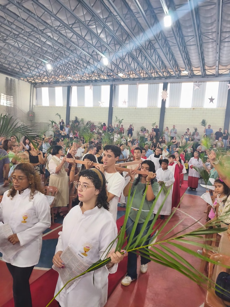 As celebrações tiveram início no Domingo de Ramos, com cerca de 500 fiéis reunidos em frente à Réplica da Casa de Dom Bosco. Após a bênção dos ramos, os participantes seguiram em procissão até a quadra de esportes, onde foi celebrada a Santa Missa. A celebração contou com expressiva participação da comunidade, destacando-se a animação do coral de adultos e o serviço litúrgico do grupo de acólitos e coroinhas, que segue em constante crescimento.