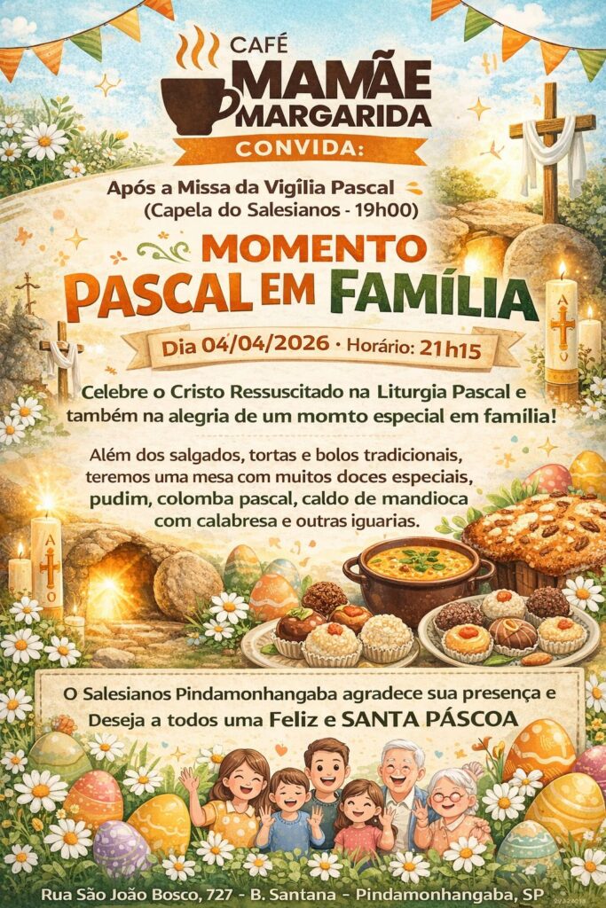 Após a Vigília Pascal, dezenas de famílias participaram do “Momento Pascal em Família”, realizado no Café Mamãe Margarida, espaço que integra a “Vila dos Becchi”. Em um ambiente acolhedor, os participantes puderam partilhar um café especial, vivendo a alegria da Páscoa também na convivência fraterna, conforme o espírito de família tão valorizado por Dom Bosco.